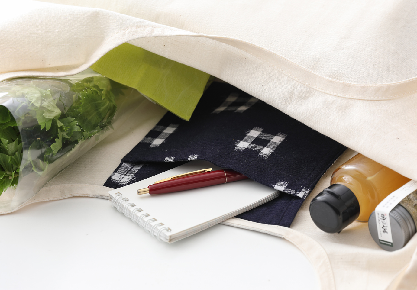 普段はかばんやバッグに入れて、お買い物のときにさっと取り出して。使わないときはくるっとたたんで「井桁」ポケットにしまいましょう。
