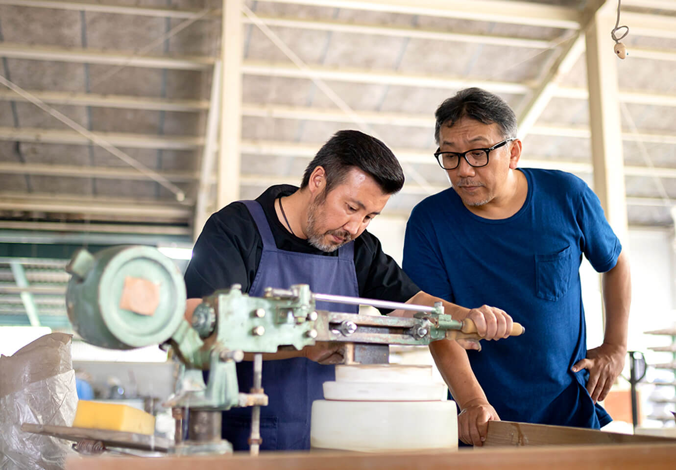 7つの窯元が集まり、新たな有田焼を発信する「ARITA PLUS」。デザインと製造に携わった寺内信二さんと末村安孝さんはこの土鍋で何度も料理を試作し、茅乃舎のだしの利用シーンを見据えた、使い勝手の良い商品に仕上げました。