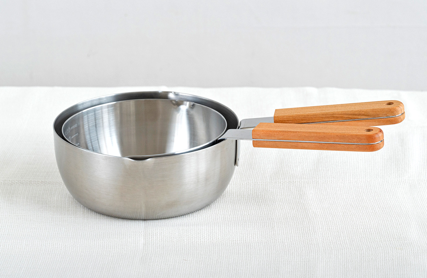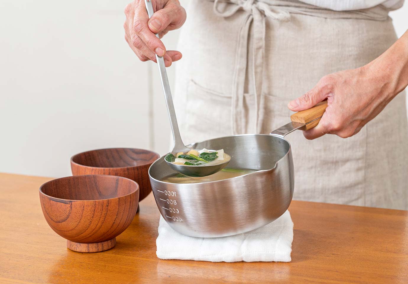 毎日使う鍋だから、限られた時間のなかで料理がおいしく仕上がり、良質なデザインのものを。そんなambai(あんばい)のものづくりに共感し、茅乃舎が手を携えてつくった雪平鍋です。