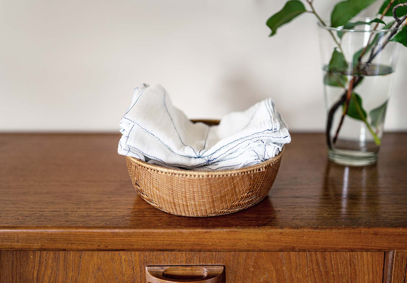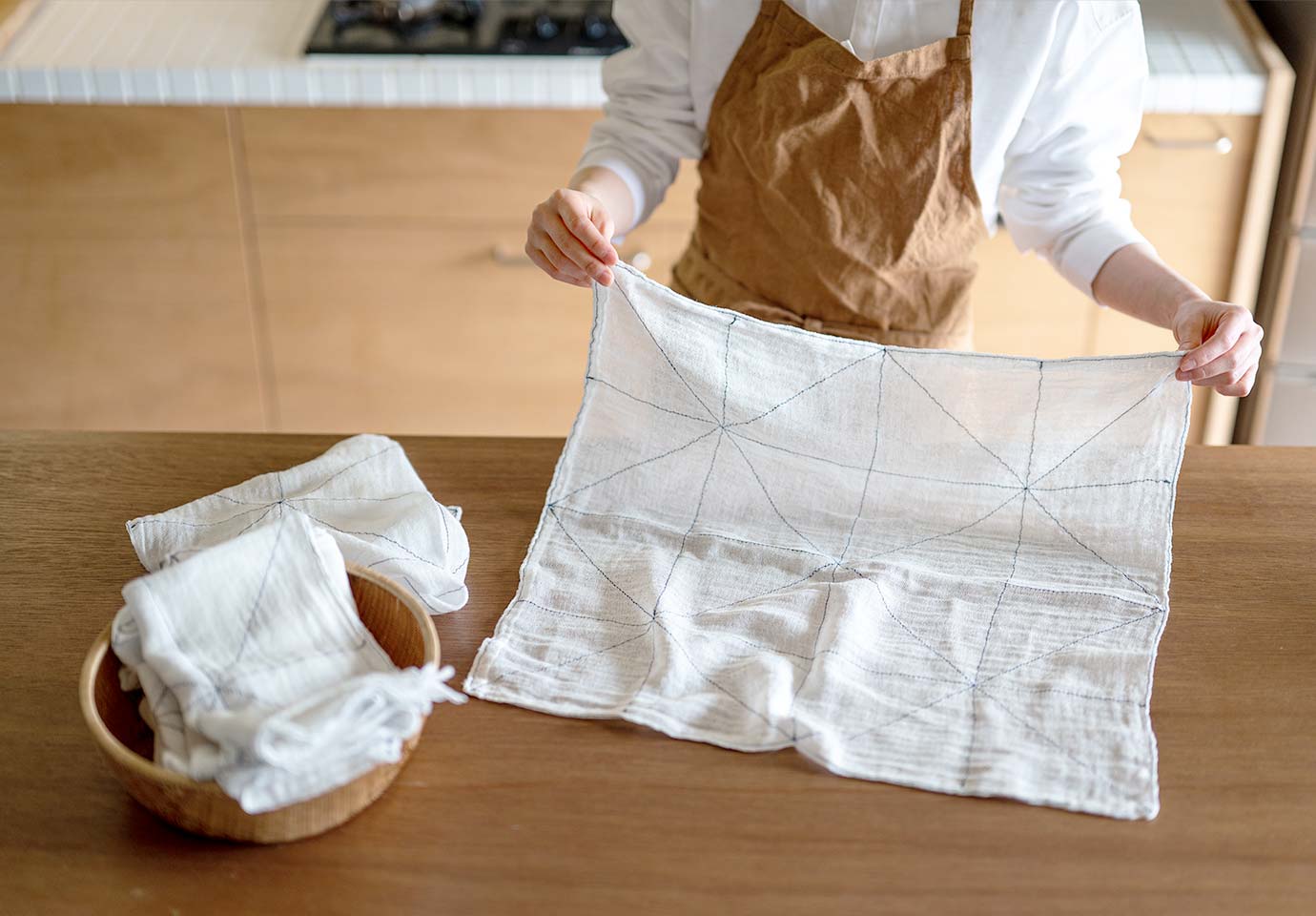 さっぱりとした佇まいで台所を整える、茅乃舎別誂えの白雪ふきん。洗いざらしのふきんが、ふんわり重なる景色もお気に入りに。まずは1枚、そして2枚と“わが家の定番”になってくれたらうれしい限りです。