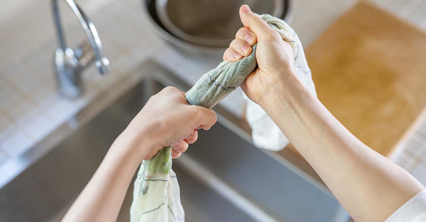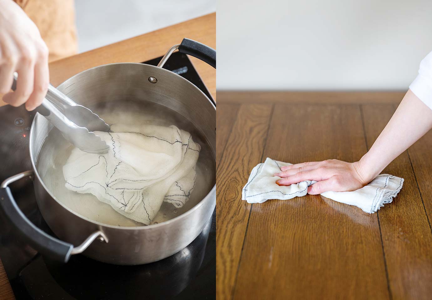 普段のお手入れは洗濯機で。気になる匂いや汚れがついたら漂白剤や煮沸ですっきり。清潔で真っ白な状態を保てます。使い古した後は台拭きにして、最後は雑巾に。長く愛用することが心地よさにつながります。