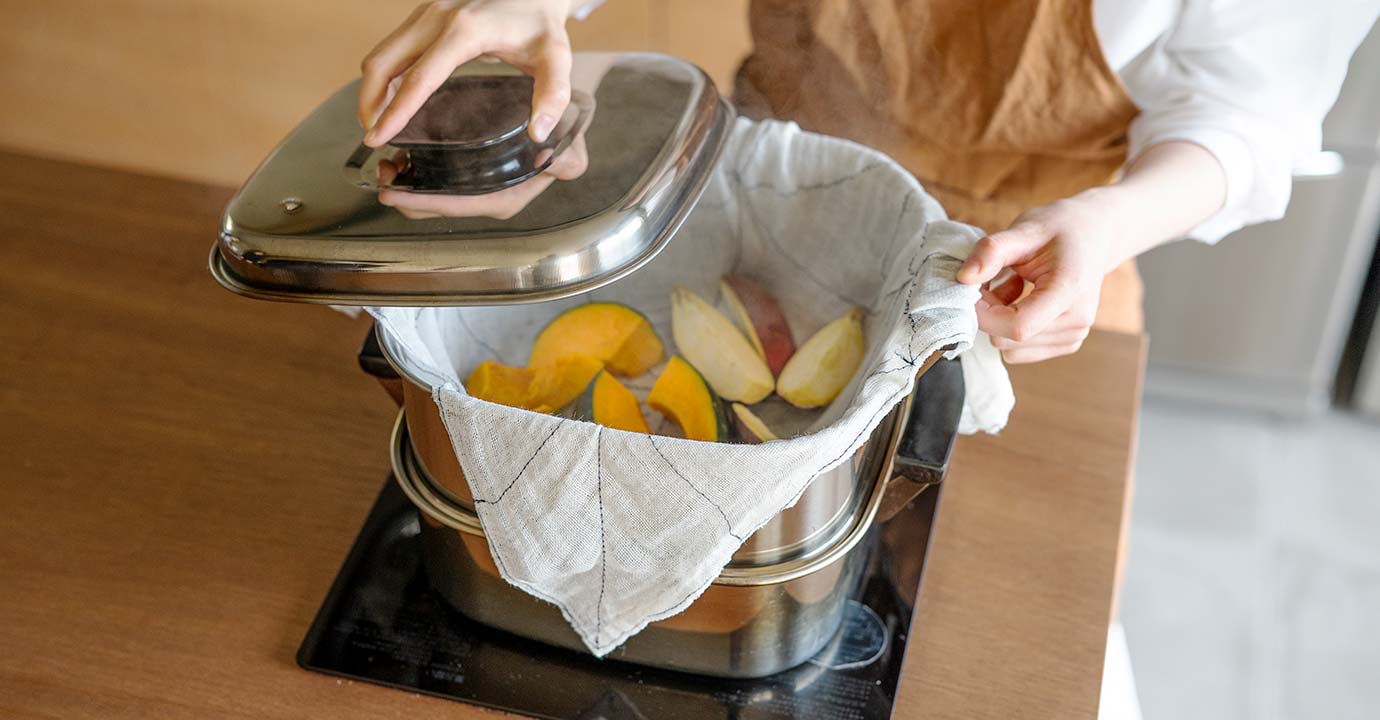 濡れたふきんで茹で野菜を絞れば、手で絞るより均等に絞れ、形も崩れにくくなります。水滴がついて蒸し野菜が水っぽくなりがちなステンレスの蒸し器も、ふきんを敷けばほっこりとした仕上がりに。