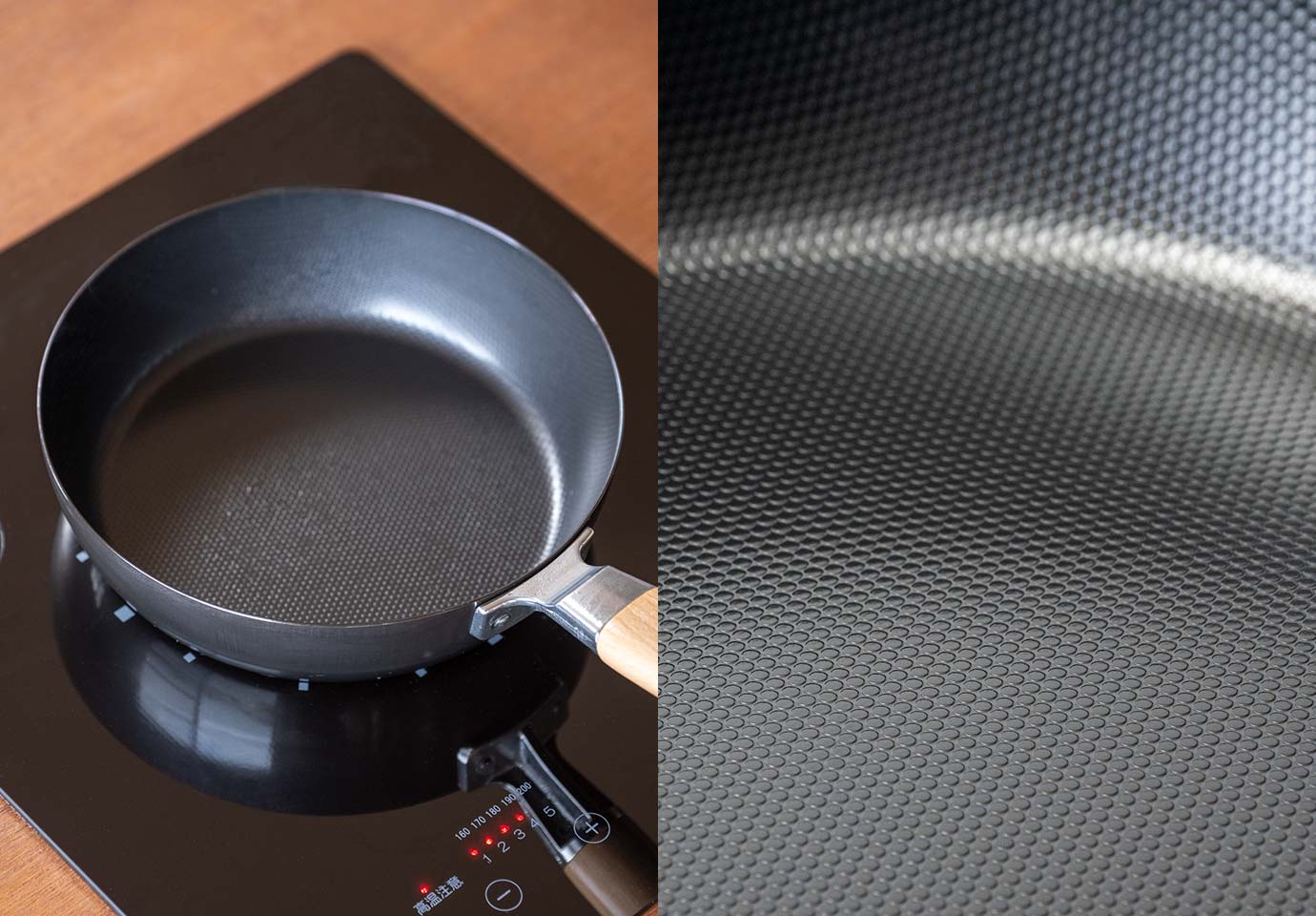 食材がこびりつく不安を解消してくれるのは、表面の細かなエンボス加工。鉄と食材が点で接するので、使い始めから「油がなじんだ使い心地」です。IH調理器でもお使いいただけます。