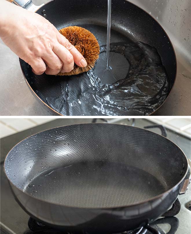 - フライパンが熱いうちに、お湯とたわしで洗う。