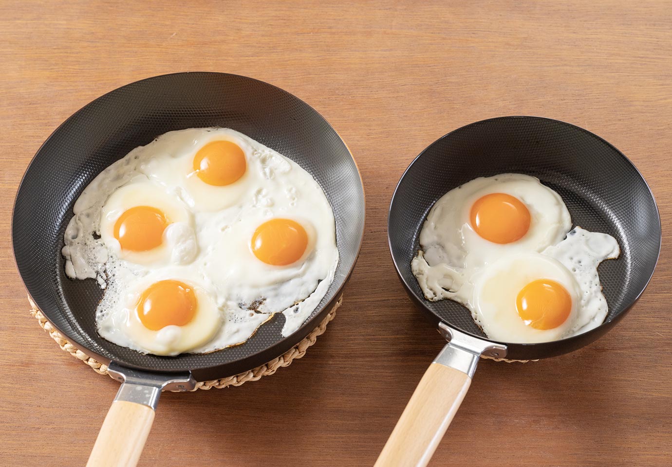 サイズ感が分かるように目玉焼きを焼いてみました。20cmは1〜2人の食卓やお弁当づくりに。揚げ物もでき小回りが効きます。26cmは大きめのステーキや家族で食べる焼きそばにも活躍する、万能サイズです。