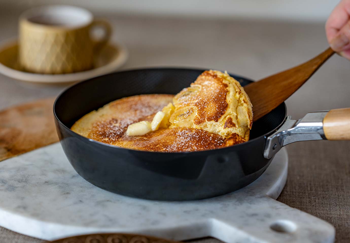 日々、台所で育てた鉄製フライパンなら、外はこんがり、中はふんわりとしたパンケーキも焼けるように。使い込むほど油がなじみ、料理の腕前をあげてくれる道具です。(写真は20cm)