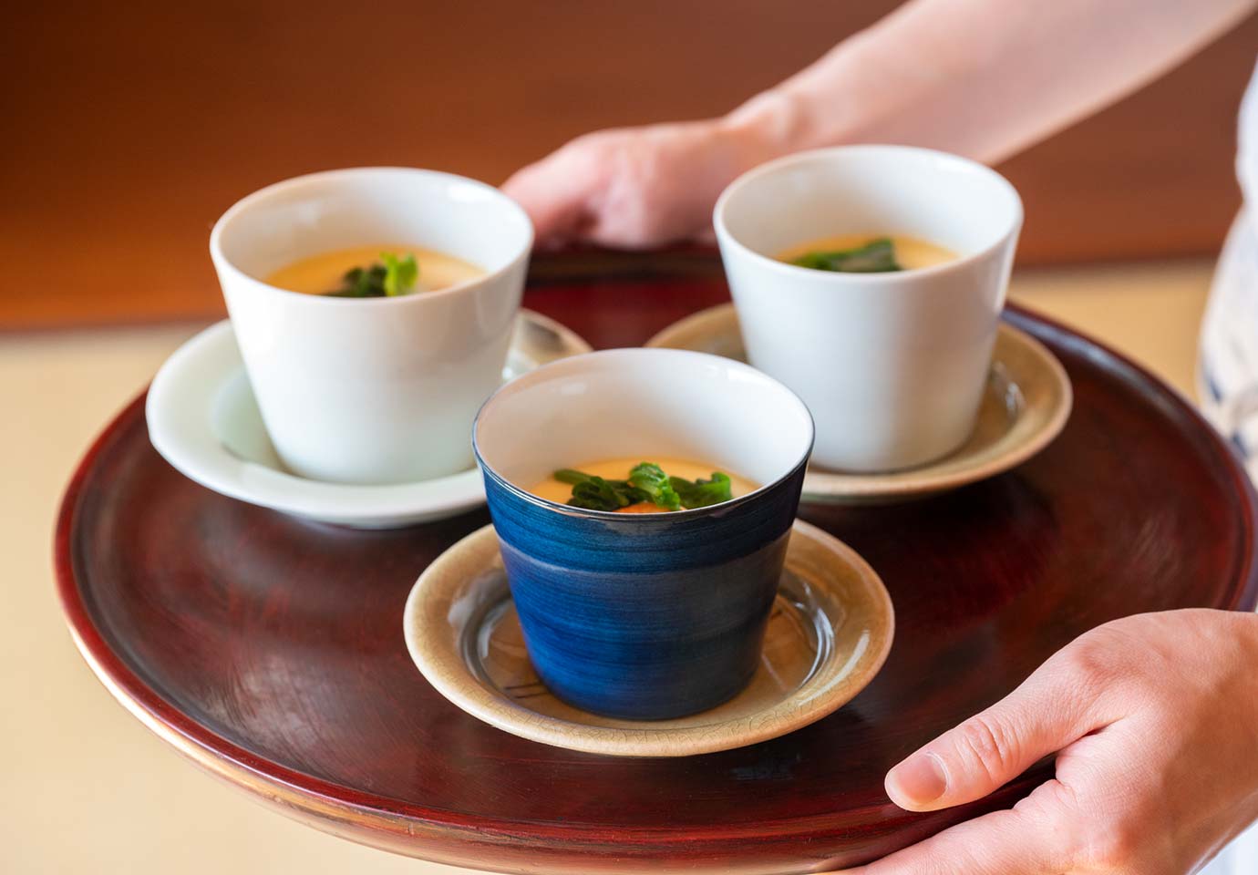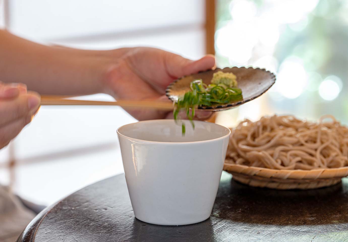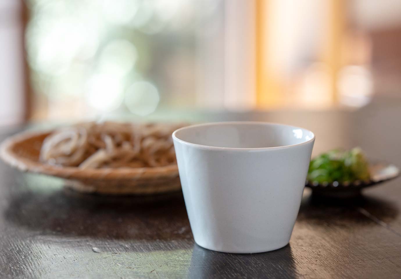 お碗でもない、カップでもない蕎麦猪口だけの佇まい。季節の食材でさっとこしらえた料理も表情豊かに。