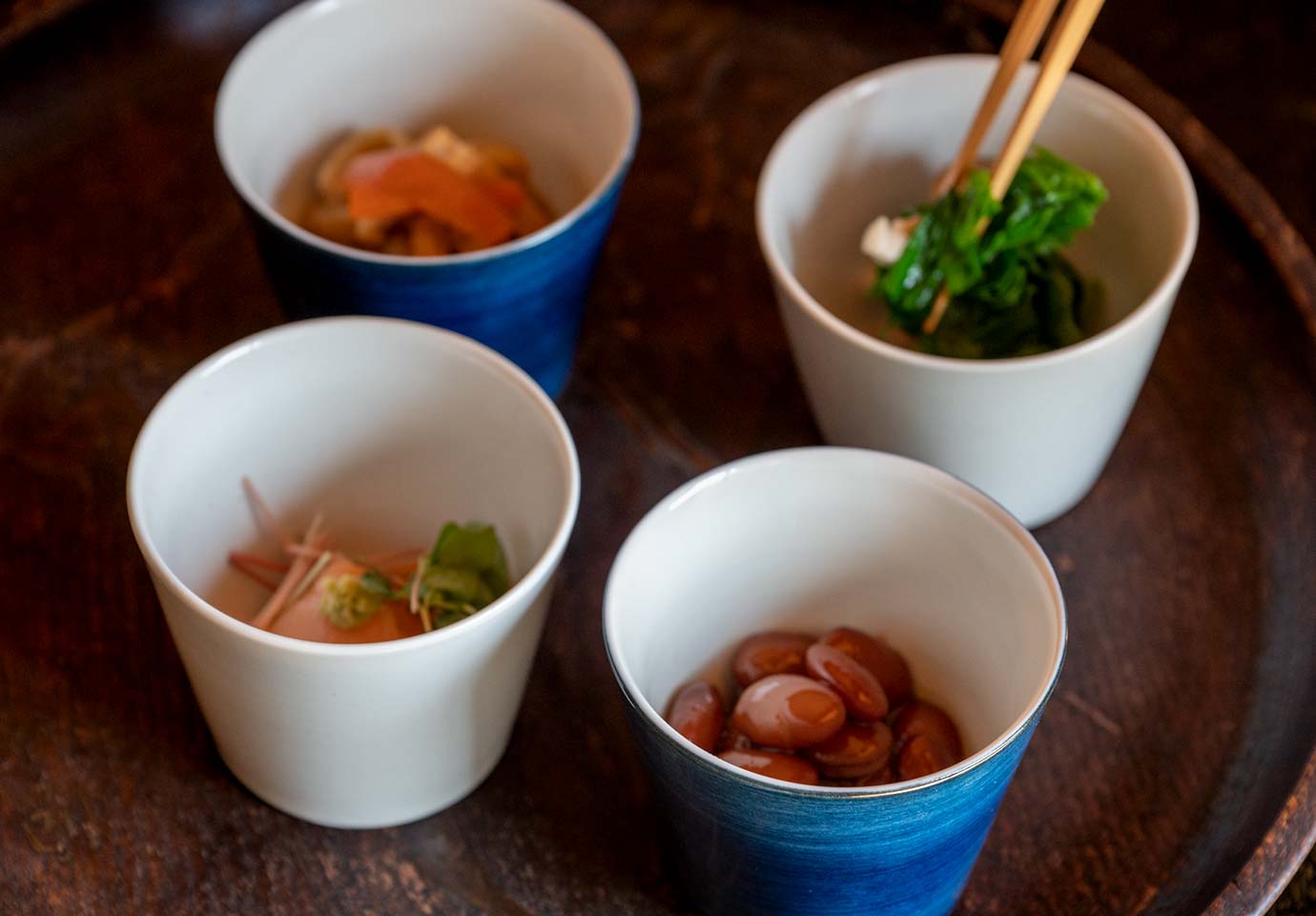 発祥当時、和え物、煮物、漬物といろいろな献立と組み合わせていた蕎麦猪口。内側の白色が幅広い食材を引き立てるので、真似していくつか並べたくなります。
