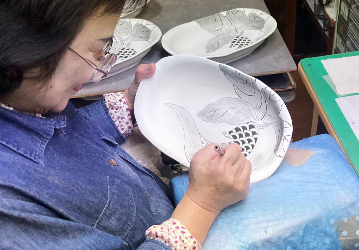 将軍家や大名に納める器を手がけていた佐賀県伊万里の大川内山。この地で1670年に創業した寛右ェ衛門窯は染付の技術で知られ、筆に含ませる絵の具と水の量を繊細に調節し、色の濃淡を表現するのが得意です。