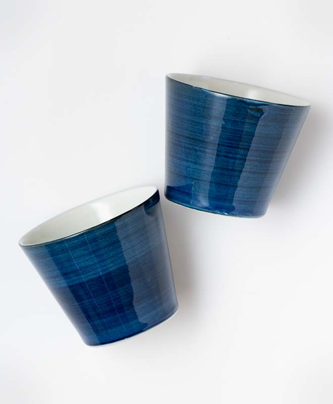 柔らかな白色の「白磁」と、透明感のある藍色の「呉須(ごす)」の2色。「白磁」は陶石に含まれる鉄分の黒点をいかして味わい深い風合いに。 「呉須」は素焼きの器に藍色の顔料を刷毛塗りし、刷毛目による藍色の重なりを表現しました。