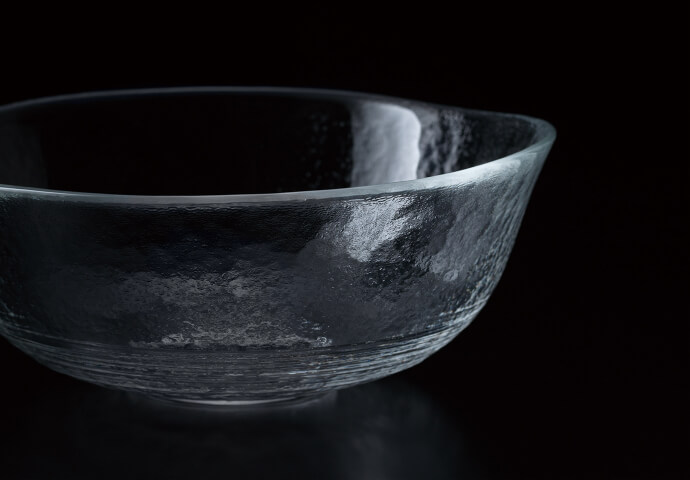 溶かした硝子を型に流し込み、回転させながら遠心力をかけて成形。ほのかな「たわみ」のある姿を生み出します。側面につけた打ち出し模様が光の屈折をより美しくして、涼やかに食卓を彩ります。