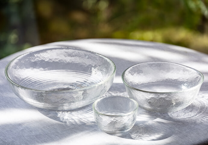ガラスの器は夏のものという枠を飛び越えて、楽しみ方が広がる硝子鉢。涼やかでいてどこか温かみのある質感を、いつもの食卓へ気軽に取り入れてください。