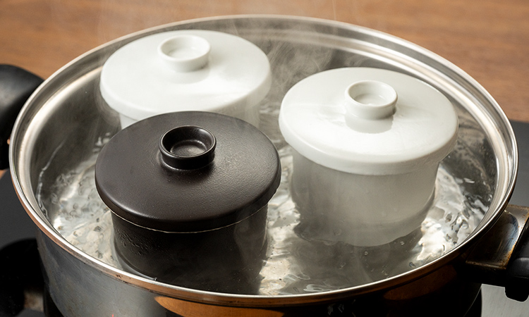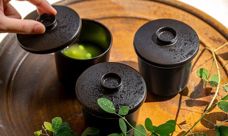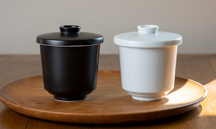 だしを楽しむ料理の代表格、茶碗蒸しを美味しく手軽につくりたい。そんなお声にお応えして、蓋付きの磁器碗を誂えました。九州の陶磁器一大産地、佐賀・有田に伝わる機能美に改良を加えて、同じく有田の窯元にて一点一点、表情豊かな鉄黒の釉薬で仕上げています。