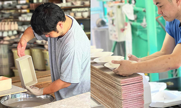 白磁は1670年創業の「瀬貞製陶所」製。近年は白磁釉薬を独自ブレンドした現代的な食器も手がけています(写真左)。鉄黒は1992年創業の「秀石窯」によるもの。自社で陶土を調合し、耐久性に優れた器を製作。成型技術を自負する窯元です(写真右)。