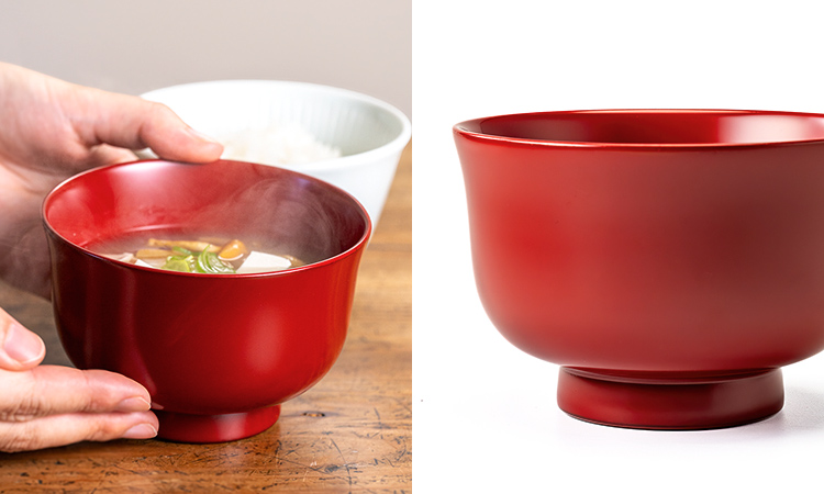 漆のお椀を手で包み込むと、しっとりとした手ざわりにほっとします。木の器ならではの柔らかな質感とじんわり伝わる熱も心地よく、汁物のある食卓がまたひとつ豊かになります。