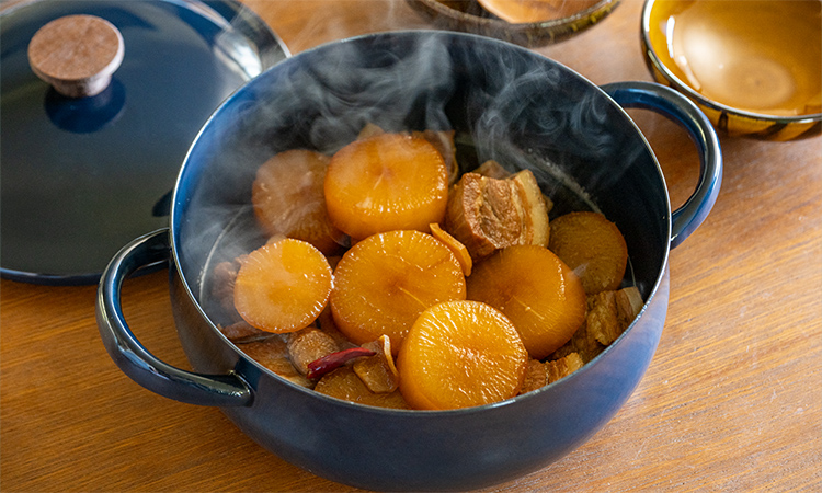 ぶり大根やロールキャベツ、煮込みハンバーグなど、食材を動かさず、形をきれいに保ちたい煮込み料理と相性がいい鍋です。静かにコトコト煮込んでいく、シチューやカレーもまかせられます。