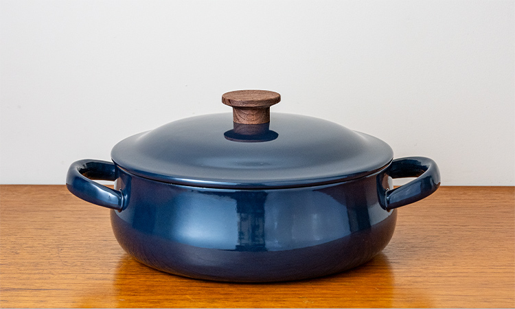 直径25cm、深さ約8㎝の広口浅型。底に向かってふくらんだ形状は熱を対流させ、じっくりと食材のうまみを引き出します。色は茅乃舎特注の鉄紺色。ガスコンロはもちろん、IH調理器でも使用でき、蓋をはずせばオーブン料理も可能です。