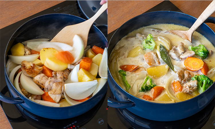 厚手の鋼板を使用しているため、蓄熱性が高く、熱ムラも少ないので、食材にすばやく火が通ります。シチューやカレーにも相性が良く、ひとつの鍋で完成します。