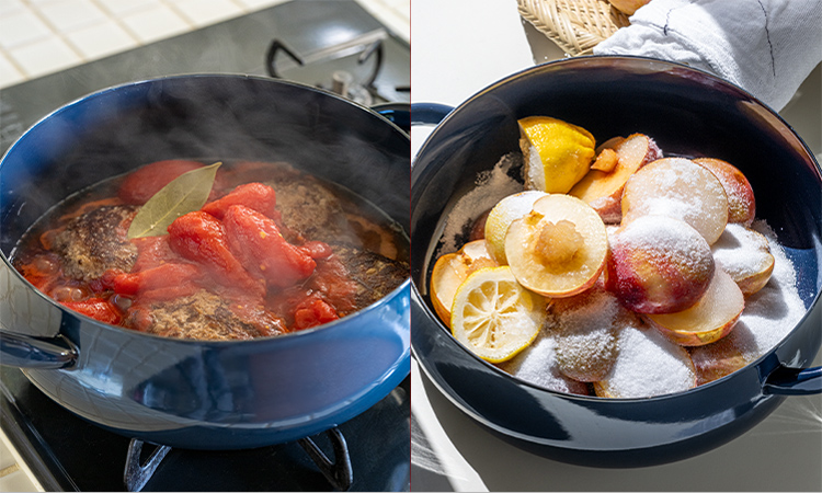 酸に強いことで知られる琺瑯鍋。トマトソースやミネストローネなど酸味のあるトマト料理にも臆せず使えます。ジャム作りにもおすすめで、広口で底から混ぜやすく、熱も味も均等に入ります。