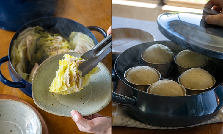 浅型の鍋はお湯が早く沸き、蒸気がしっかり回るのも特徴です。肉と野菜の重ね蒸しや、足つきの網を敷いて、蒸しパンを作ったり。アイデア次第で使い方が広がります。