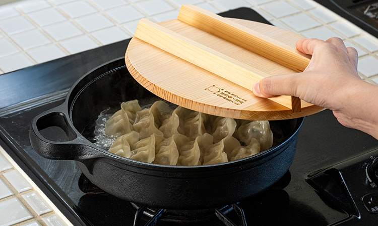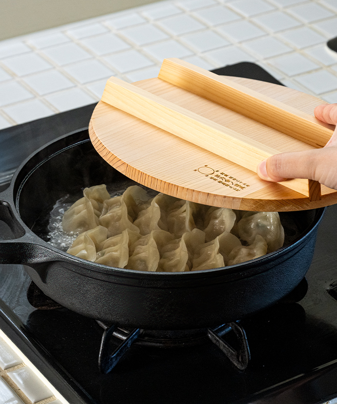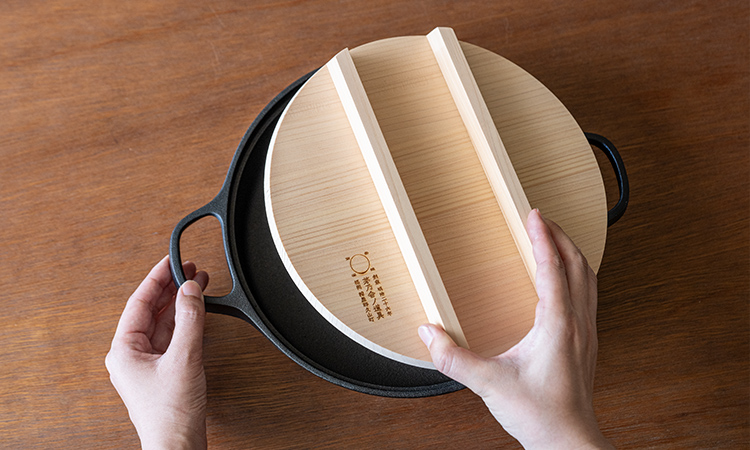 蓄熱性が高い鋳物は、じっくりと火を通す料理も得意です。茅乃舎特注の国産椹(サワラ)材の木蓋をかぶせると、対流熱を閉じ込めつつ余分な水分を逃がす構造に。焼き物はふっくら香ばしく仕上がり、鍋料理のアク取りもかないます。