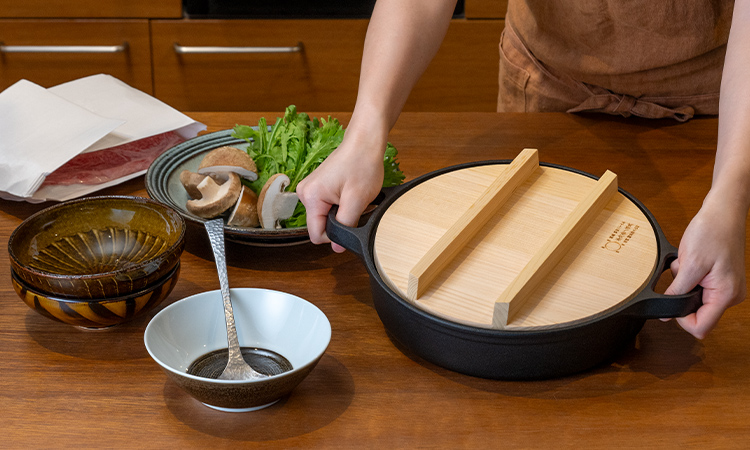 戸棚の奥にしまい込まず、日々さまざまな料理に活用できるすき焼き鍋。来客のときは、ひと味違うすき焼きはもちろん、餃子やオーブン料理もふるまいたくなります。IH調理器で使えるのもうれしいところです。