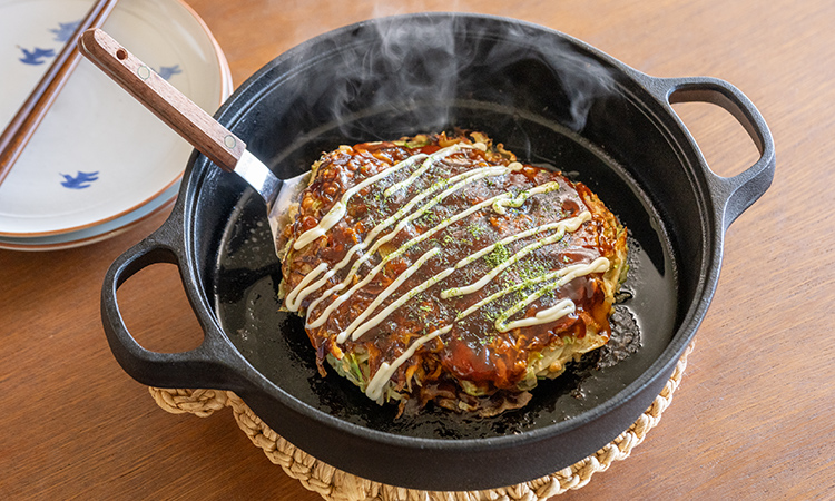 蓄熱性が高い鉄鍋を使えば、お好み焼きも表面はカリッ、中はふっくらとした焼き上がりに。鉄鍋ごと食卓に出して熱々をいただけます。またステーキやハンバーグも上手に焼けて、いつものおかずがお店の雰囲気で味わえます。