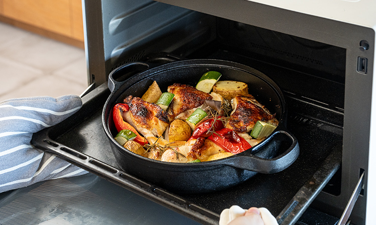 取っ手も鋳物製なので、オーブン料理にもそのまま使えます。肉と季節の野菜を一緒にローストするだけで、立派なおもてなし料理の完成です。