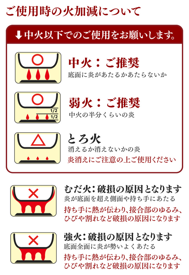 ■加熱をする際は「弱火」から始め、「中火」以下でご使用ください。