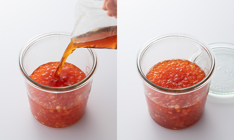 - 2. 専用の特製昆布たれに、解凍したいくらを浸し、冷蔵庫で 24 時間漬け込みます。