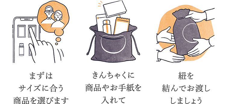 お客様ご自身でお好みの商品を組み合わせ、贈り物にできるきんちゃくをおつくりしました。シンプルなデザインと普段づかいしやすいサイズで、受け取った後も小物入れとして繰り返しお使いいただけます。
