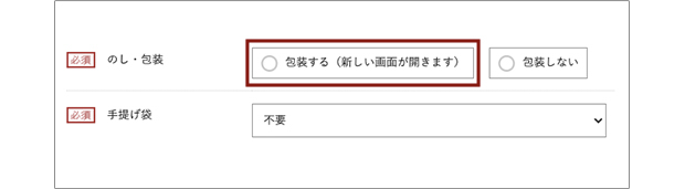 【手順1】[ギフト・お届け日時設定]ページの[ギフト設定]にて[のし・包装]項目の[包装する]を選択します。