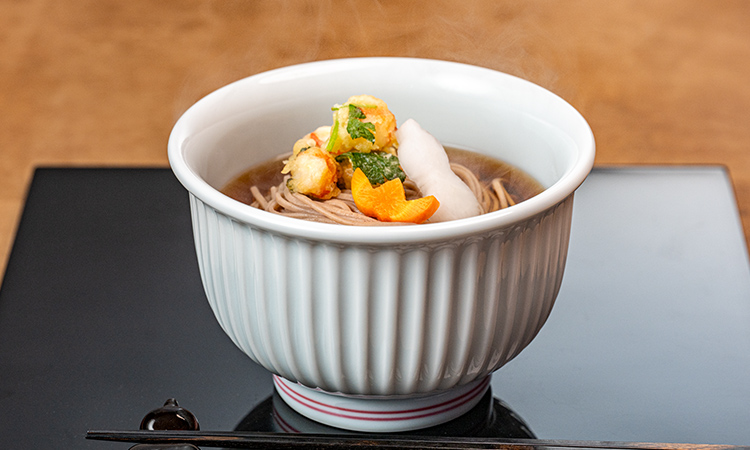 「挽きぐるみ粉」を配合した蕎麦の香りを楽しめる二八蕎麦とだし、つゆをセットにしました。慌ただしい大晦日の締めくくりに、手早く準備できる年越しそばです。