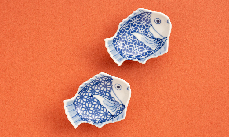 江戸時代から続く有田焼の窯元・梶謙製磁社製の「招福鯛」。右向きの鯛ゆえ運勢が「右肩上がり」になると伝わる縁起物を、「めでた箱」限定品として、幕府に献上された歴史がある佐賀県の伝統織物「佐賀錦」をイメージした絵柄でおつくりしました。さまざまなご縁やお子さまの成長、金運、仕事運などの「福」を毎日に招き入れます。