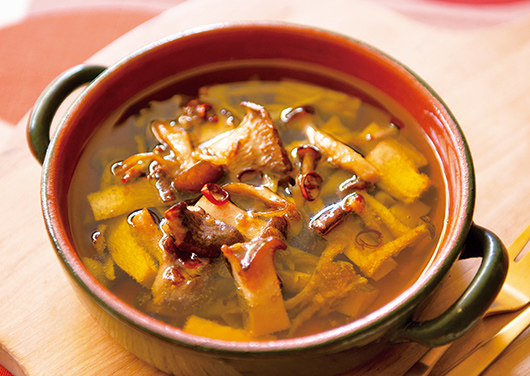 オイルの色が濃くなってきたら、うまみが十分にオイルにしみ出た合図。すぐに濡れ布巾などで鍋底を冷やし、粗熱をとる。