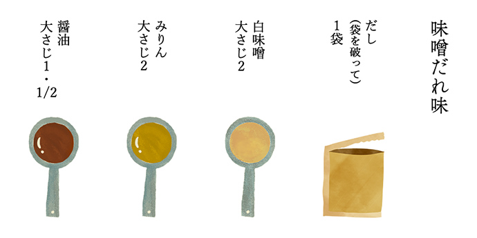 だし、みりん、醤油に味噌を足して、味に変化を。汁感がないので、だしは破って加えます。