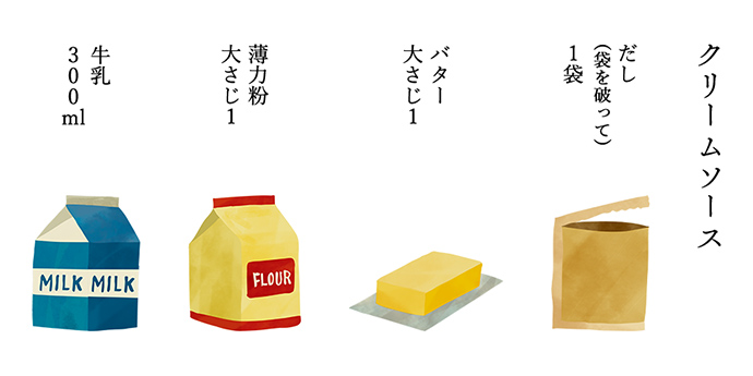 だしと牛乳だけで味ができます。バター+薄力粉はソースのとろみづけに使います。